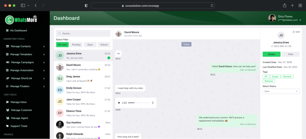 WhatsMore offers WhatsApp CRM tools, message automation, contact segmentation, multi-agent inbox, campaign analytics, and lead tracking.